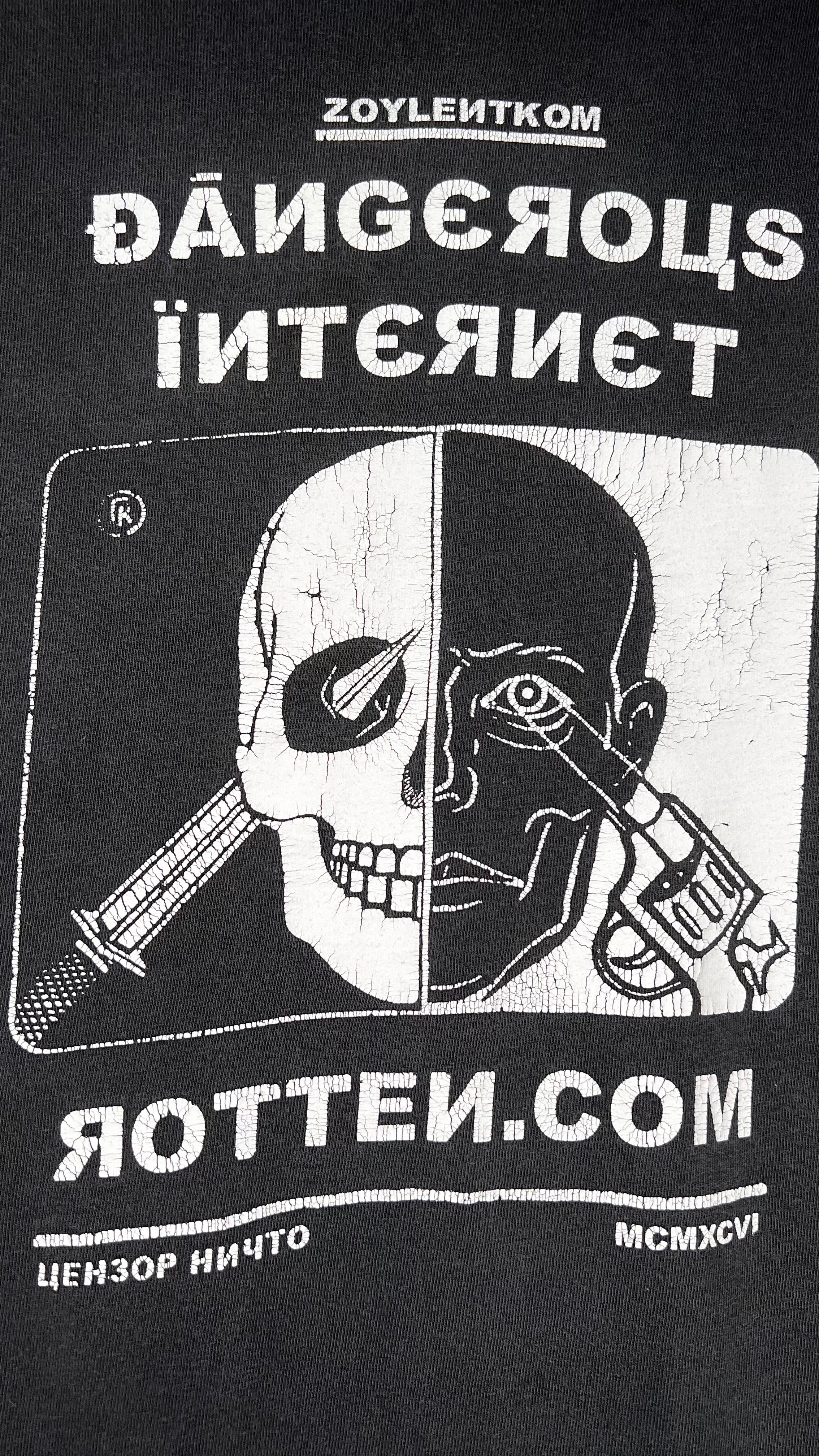 THIS IS A SUPER RARE OFFICIAL ROTTEN.COM MERCH PIECE FROM THE FIRST YEAR THE SITE WAS LAUNCHED. BOTTOM LEFT TEXT IN RUSSIAN TRANSLATES TO “CENSOR NOTHING” & 1996 IS SEEN IN ROMAN NUMERALS BOTTOM RIGHT